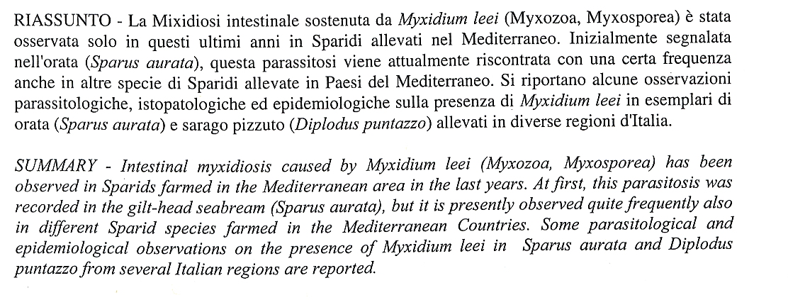 Myxidium leei (Myxozoa, Myxosporea) in sparidi (Sparus aurata e Diplodus puntazzo) allevati in Italia. / Myxidium leei (Myxozoa, Myxosporea) in sparids (Sparus aurata e Diplodus puntazzo) reared in Italy.